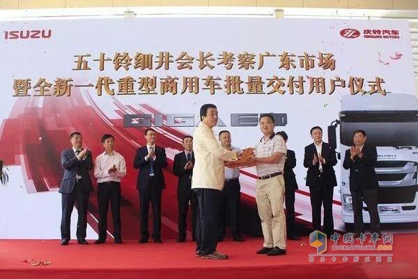 2017年9月27日,在眾協(xié)汽車銷售公司(廣州慶鈴五十鈴經(jīng)銷商),舉行了一場五十鈴巨咖重卡的大批量交車儀式,30臺6X4牽引車交付韶關(guān)三合星運輸有限公司,而該物流公司的老板廖錦波先生,正是五十鈴的30年老用戶。