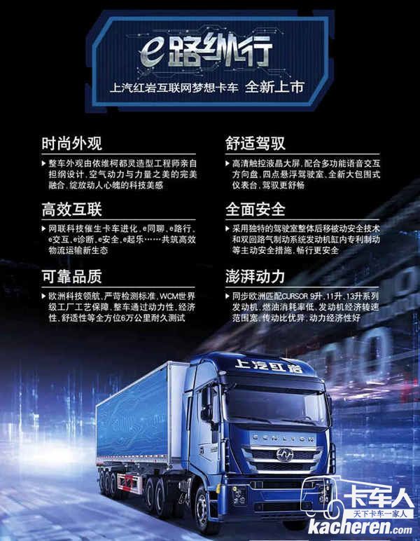 紅巖互聯網夢想卡車的開發同樣秉承了這樣的理念,除了在安全、油耗、舒適以及經濟性方面注入了國際化高標準的品質設計與制造工藝,上汽紅巖還聯合重卡匯科技有限公司打造的重卡匯平臺,也為卡友們提供了卡車全生命周期的綜合性服務。