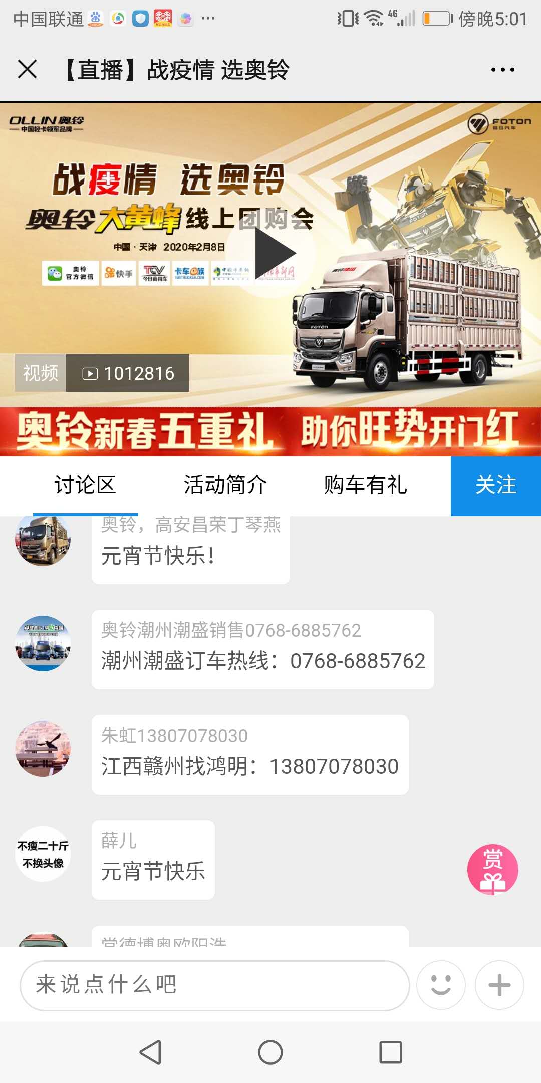 2020年2月8日下午3-4點,新年元宵節(jié)當天,奧鈴線上團購會繼續(xù)進行,在短短一個小時的直播團購中,吸引100多萬人參與,大家積極討論,熱情參與,積極購車。