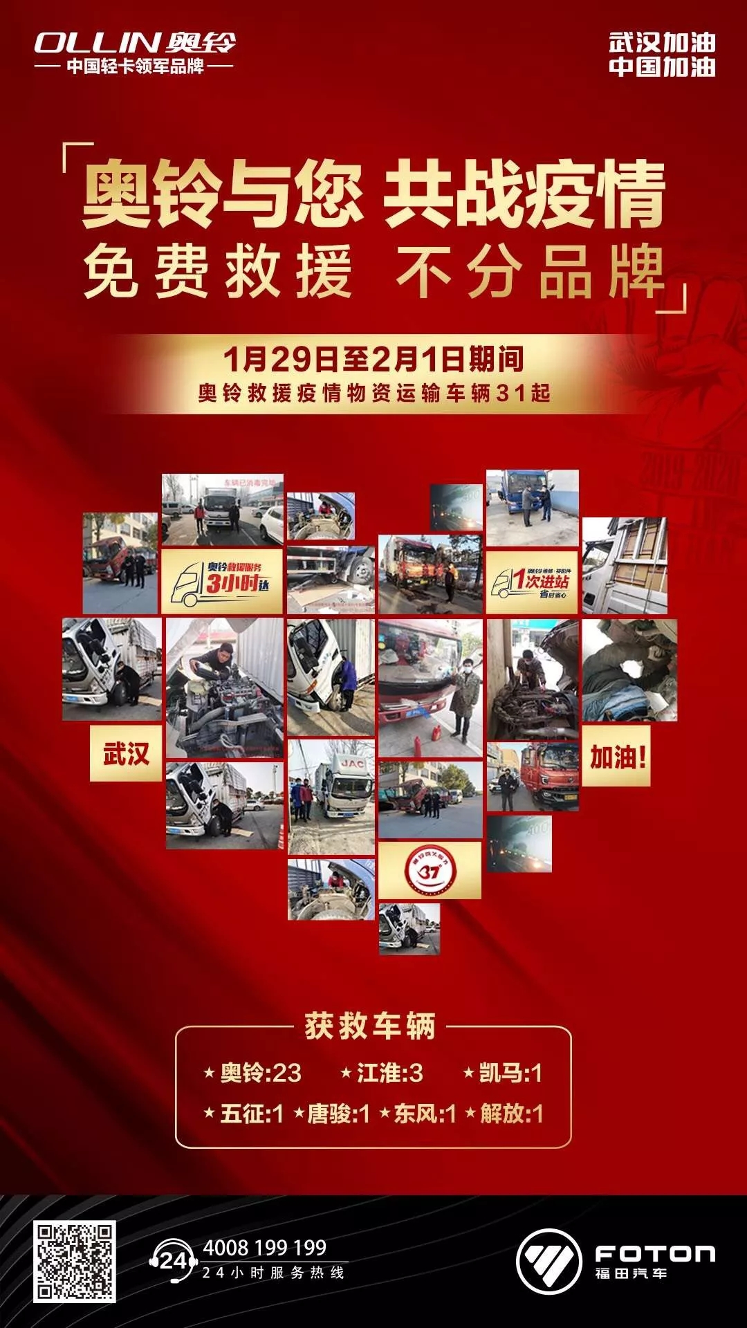 并決定從正月初五12點起,奧鈴維修工人為運輸物資的卡車司機提供救援服務、共抗疫情,同時向全國卡車客戶承諾:免費救援,限時三小時達——無論卡車人駕駛任何品牌的輕卡、中卡車輛,當出現故障時。奧鈴售后服務承諾在3小時內到達現場。
