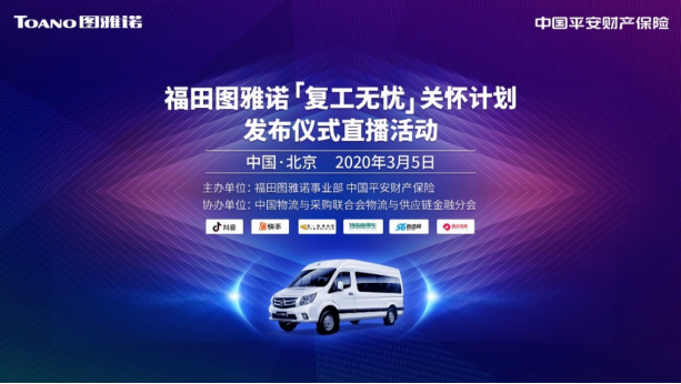 2020年3月5日,由福田圖雅諾事業(yè)部、中國平安財(cái)產(chǎn)保險(xiǎn)主辦,中國物流與采購聯(lián)合會(huì)物流與供應(yīng)鏈金融分會(huì)協(xié)辦的“福田圖雅諾&中國平安‘復(fù)工無憂’關(guān)懷計(jì)劃”在北京正式發(fā)布。活動(dòng)期間,福田圖雅諾“復(fù)工無憂”關(guān)愛計(jì)劃將免費(fèi)向福田圖雅諾新購車客戶贈(zèng)送“復(fù)工無憂”險(xiǎn),凡客戶遭遇包含因新冠狀病毒傳染導(dǎo)致停業(yè)等損失均由中國平安進(jìn)行賠付,降低客戶復(fù)工運(yùn)營風(fēng)險(xiǎn),免除客戶復(fù)工復(fù)產(chǎn)的后顧之憂!