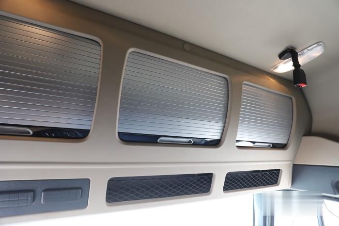 在儲物空間方面,駕駛室上方為三個儲物格,掀蓋裝配液壓挺桿,三個儲物格內部空間大,但材質顯得有點單薄。下鋪空間能滿足日常生活休息。
