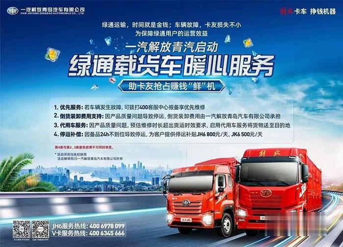 最讓用戶擔心的三大件質量都有保障,綠通運輸路上自然暢通無阻。當然,為了完全解除用戶的后顧之憂,解放青汽在服務上也是不斷的加碼。在這次暖心服務中,除了上述服務內容外,企業還提出了停運補償:因備品24小時不到位導致停運,為客戶提供停運補貼,其中JH6 800元/天,JK6 500元/天。