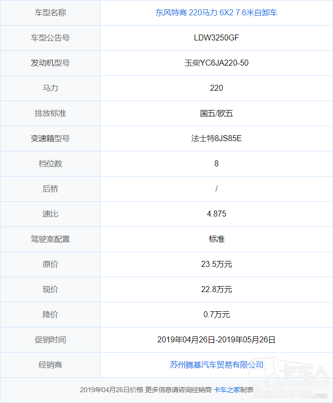 據本站最新消息,2019年04月26日-2019年05月26日 東風特商 220馬力 6X2 7 6米自卸車(東駒牌) 在蘇...