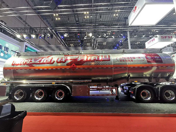 在整個展廳燈光的映射下,這款上汽紅巖杰獅C50e智能危化車銀光閃閃,格外惹眼,因為無論是輪轂還是掛車都采用鋁合金材料,大約5.5噸的掛車設(shè)計進(jìn)一步提升整車載荷量。